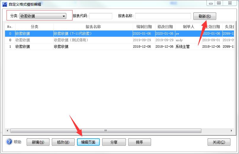 2.分類選擇“收款收據(jù)”后點(diǎn)擊【刷新】,選擇需要添加收款二維碼的收款收據(jù),點(diǎn)擊【編輯頁面】。