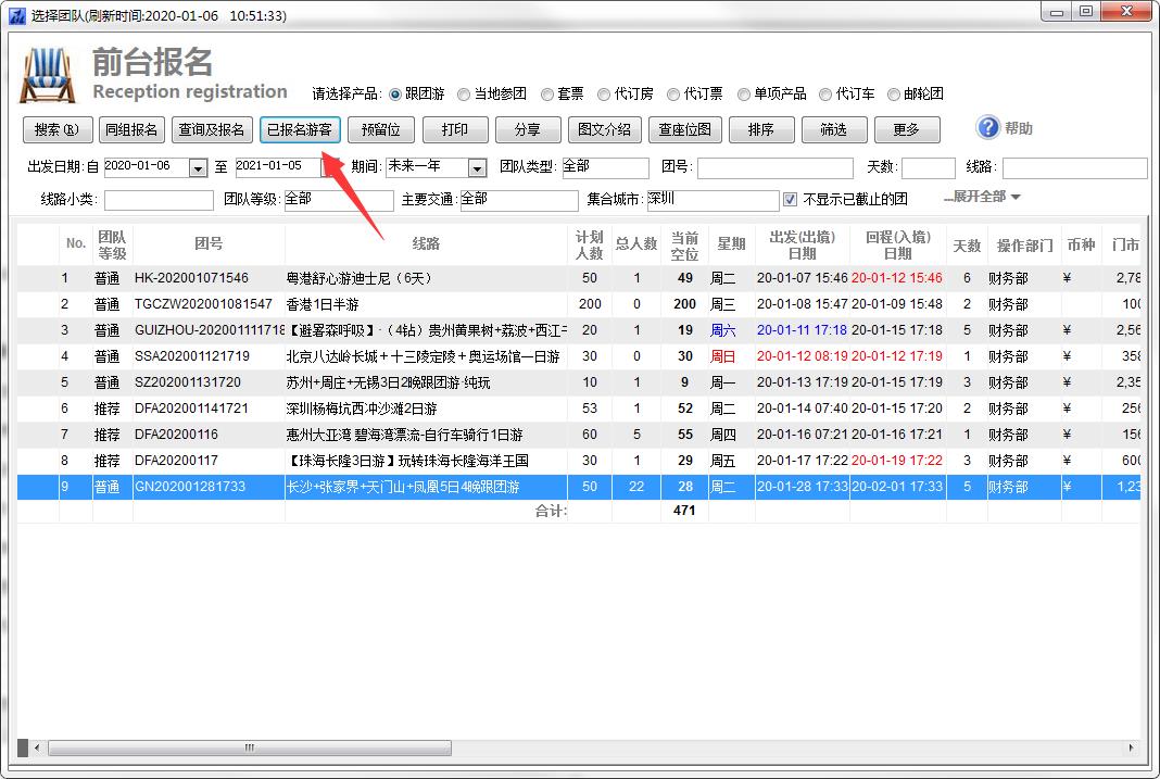2.檢索出團(tuán)隊(duì),選中團(tuán)隊(duì),點(diǎn)擊【已報(bào)名游客】。